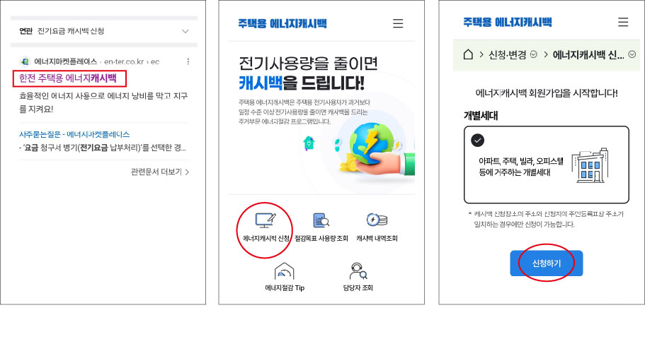 ● 주소 변경 시 재신청 : 만약 주민등록 주소가 변경되었다면, 기존 주소지의 에너지 캐시백을 해지하고 새로운 주소지로 재신청하셔야 합니다. 새로운 주소지에서는 신청일이 속하는 월부터 캐시백이 적용됩니다.